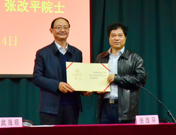 张改平院士被聘为我校客座教授,武海顺校长为其颁发聘书。(白晶/文 苏继文/摄)