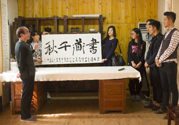 75岁高龄的樊习一先生精神矍铄,为大学生们讲述了自己往昔的学书经历、在艺术实践中的认识和感悟,并对同学们在专业理想、人生规划等方面提出了殷切期望。他说,如今学习书法的条件和环境非常好,同学们选择书法专业是幸福和幸运的,一定要珍惜大学时光,合理安排时间,学有所成,今后为书法教育和书法事业的发展贡献力量。他强调,书法是国粹,切勿以书法为“小道”,要多读书,多研习,才能真正领悟书法真谛。他还现场书写了“书道千秋”四个大字,勉励同学们把书法艺术作为优秀文化传承的“大道”精研深修,继承创新。