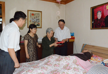在中国人民抗日战争暨世界反法西斯战争胜利70周年纪念日来临之际,根据党中央、国务院对抗战时期及以前参加革命工作的离休干部开展慰问活动的要求,8月29日上午,校长武海顺、校党委副书记王心平,在校办、组织部、人事处、离退休处等相关部门负责人的陪同下,看望慰问了我校离休老干部柴正平同志,向他表达了党和政府以及学校对老干部的敬意与关心,并送上中共中央、国务院、中央军委联合颁发的中国人民抗日战争胜利70周年纪念章与慰问金,感谢他为党的事业所作的贡献,衷心祝愿他身体安康、生活幸福。柴正平同志生于1924年,1939年参加工作,今年92岁。校领导非常关心老同志的身体和生活情况,与其家属亲切交谈,详细了解他们的实际情况和困难,表示将竭尽所能为他们排忧解难。老同志家属对学校的关心和照顾表示最真挚的感谢。(白晶/文 苏继文/摄)