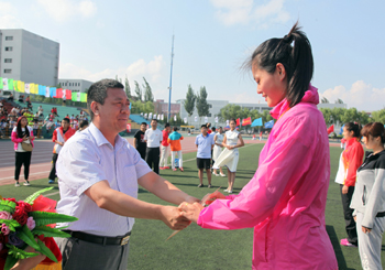 大同大学校长常乃军(左五)为我校体育院系组(左三)颁发团体奖杯