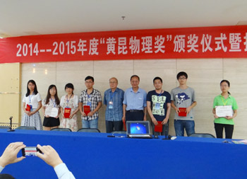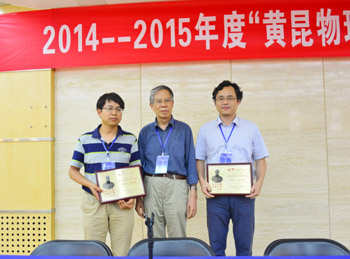 7月18日下午,在实验楼四层报告厅举行了2014-2015年度“黄昆物理奖”颁奖仪式暨报告会。会上,郑厚植院士为两位获奖者颁发了2014-2015年度黄昆物理奖获奖证书。会议还设置了“最佳墙报奖”,经多位专家无记名投票,最终由10名优胜者获得了此奖项。