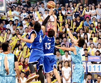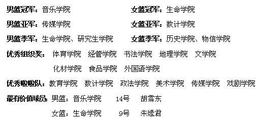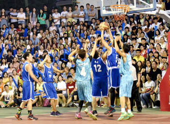 此次大赛由学工部(处)、教务处、校团委、校学生会主办,体育学院公体部承办。共有18个学院参赛,18支男篮代表队,16支女篮代表队和17支啦啦操队共计700余人参加了比赛。为增加篮球比赛的精彩性与观赏性,男子组继续沿用选秀制,分两个大区,各区比赛决出冠军,两个分区冠军争夺总冠军,经管学院、书法学院、音乐学院、生命学院、数计学院、地理学院、研究生学院和传媒学院闯入八强。女子组采用单场淘汰制,生命学院、数计学院、历史学院、物信学院进入四强。