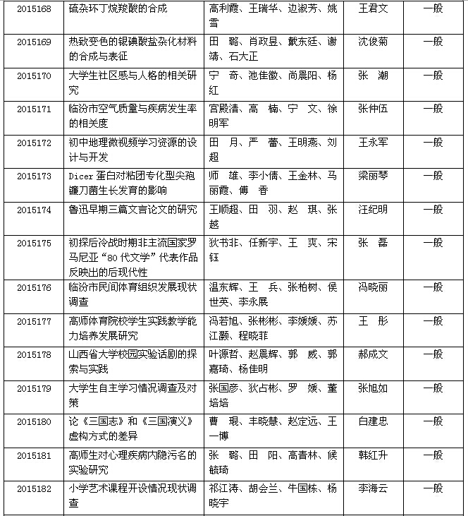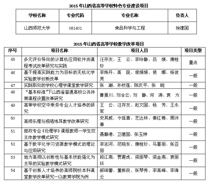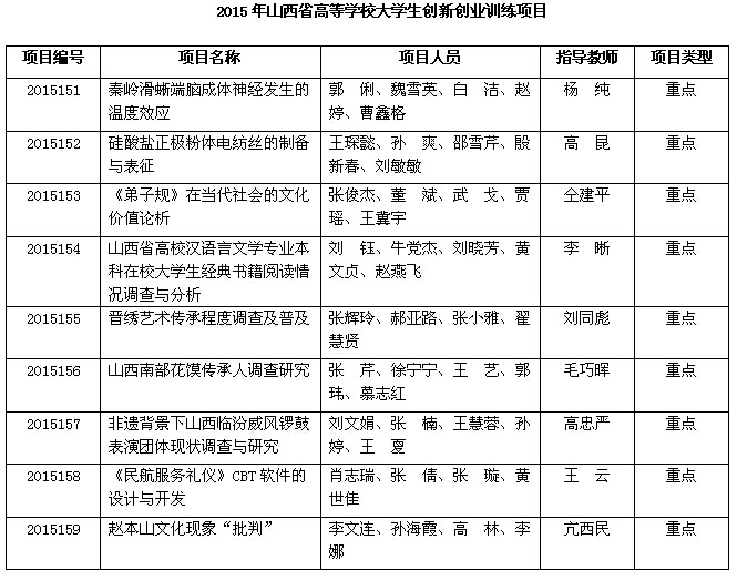 近日,山西省教育厅发文公布了《关于公布2015年山西省高等教育质量和水平提升工程中三个教学项目评审结果的通知》(晋教高[2015]1号),我校共获评1项省级特色专业建设项目,10项省级教学改革项目,35项省级大学生创新创业训练项目。各项目获评数量在全省各高校中名列前茅。(教务处 供稿)