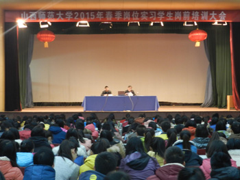 1月13日上午,我校2015年春季岗位实习学生岗前培训大会在文化活动中心举行,来自全校15个学院的1131名2011级、2012级师范生参加了本次岗前培训大会。教务处处长范哲锋出席会议并为将上岗的实习生们作了首场培训。培训大会由教师教育学院副院长、基础教育教师培训中心主任闫建璋主持。