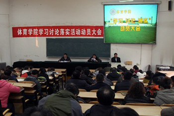 2014年12月26日上午,体育学院在三校区阶一教室召开了深入开展学习讨论落实活动动员大会,就学习讨论落实活动进行了专门部署和安排。院领导、院各党支部成员及全体教师参加了会议。会议由院长郑旗主持。