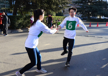 环校混合接力赛,按照每个学院出十位选手,六名男生、四名女生分为A、B组进行比赛。枪声一响,选手们如离弦之箭奋力奔向赛道,场面十分热烈。每一棒的选手都拼尽全力为学院争光,在比赛路线的每个路段都有各个学院的同学为选手们加油呐喊,还有的同学陪同选手一起跑为其鼓劲。冬日的寒冷丝毫掩盖不了同学们积极参赛的热情。