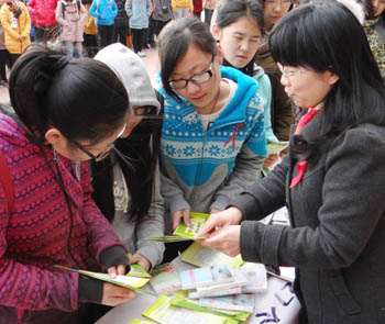 临汾市疾病防控中心的医护人员正在为大学生宣传艾滋病的预防知识