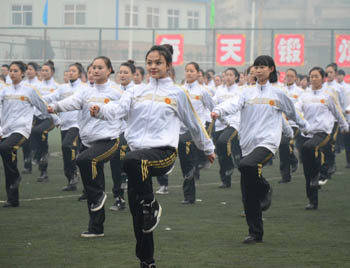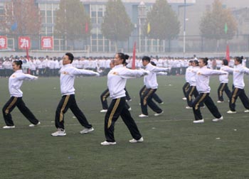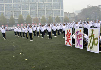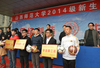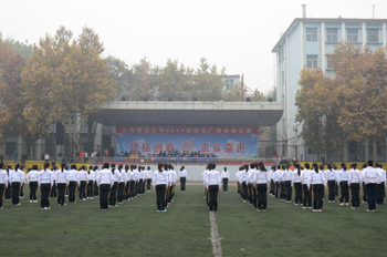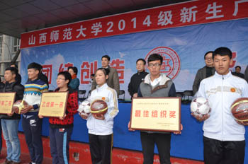 在激昂的音乐声中,校体育运动委员会副主任、校办主任薛珠峰宣布本次2014级新生第九套广播操比赛到此圆满结束。(颉金娟 姜亚楠/文 饶二保 苏继文 罗再兴 田阳 郭航慧/摄)
