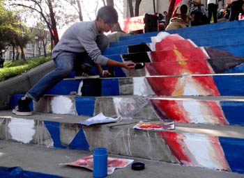 据了解,这些涂鸦作品均来自我校美术学院美术空间社团,他们以“美”为本,在同学们上学必经阶梯及旁边的矮墙上塑造了一个个灵动的卡通形象和极具艺术感的多彩图案。“此次的涂鸦活动准备已久,从前期的审批场地到购买颜料再到活动当天的组织安排工作,历时一个多月”,活动负责人之一戎有为这样介绍道。活动开展当天是休息日,但热情高涨的“艺术家们”一早便来到了场地。首先开展场地清理工作,来往的行人较多,楼梯台阶的杂物繁多给清理工作带来很大困难。针对这样的情况,美术学院的同学们并未抱怨,认真仔细地打扫每一个角落,以便为稍后的艺术创作提供清洁的场地。清理工作结束,此次彩绘活动的重头戏隆重开演。涂鸦秀在悠扬音乐声中正式开始,他们先是用粉笔勾勒出大致的轮廓,随后便拿起手中的画笔用事先调制好的颜料上色,一双双灵动的手挥动过后,诸多缤纷的色彩、动感的画面随之出现在大众的视野中。
