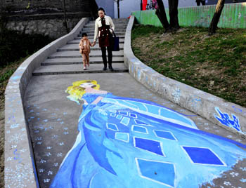 一位老师领着小朋友正走在画有“冰雪女王”的台阶上