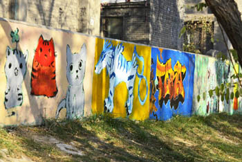 在通往莳英园的墙面上,美术空间同学们用画笔画出各种动物图案