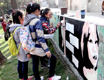 在通往莳英园的墙面上同学们正用画笔在墙上塗鸦