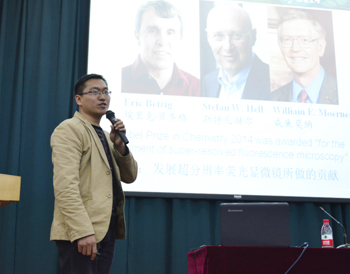 报告会上,吴昊副教授首先简要介绍了本届诺贝尔化学奖获得者——美国的埃里克•贝齐格、威廉•莫纳和德国的斯特凡•赫尔和获奖理由即在发展超分辨率荧光显微镜上作出了重要贡献。吴老师介绍了荧光的特点。他围绕“如何绕过束缚”这一课题,先后在座师生解读了传统显微镜的局限性,超分辨率荧光显微镜的研发思路和工作原理,并且就“疾病研究”角度,阐释了这种显微镜的实际应用价值。吴老师引用乔布斯的经典语录,从“学科交叉”,“创新品质的培养”,“好奇心的重要性”和“做事态度”四个方面给在座同学提出了努力方向。最后,主持人副院长贾剑锋作了总结发言。