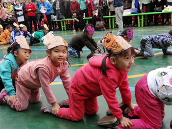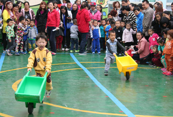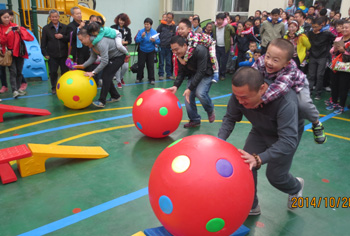 本届运动会主要由幼儿比赛、家长比赛、亲子比赛等项目组成,针对中大班幼儿的年龄特点进行游戏项目的设置,内容丰富、形式有趣。在活动中发展了幼儿走、跑、跳、钻、爬、平衡等基本动作,培养了孩子们良好的品质。同时为了充分调动家长们的积极性,也为家长们精心准备了比赛项目。如家长的“小矮人迎面接力”;亲子游戏“亲子迎面接力赛”;幼儿的“毛毛虫钻洞”、“障碍接力赛”、“运西瓜”、“车轮滚滚”、“小蚂蚁竞走”、“踩高跷比赛”等。运动场上,孩子们个个精神抖擞,脸上充满欢乐、激动的神情。呐喊声、助威声、加油声、欢呼声,此起彼伏,十分热闹。家长朋友们在老师精心设计的比赛项目中玩得也是不亦乐乎。
