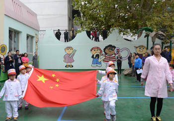 运动会开幕式上,各个班级的小运动员们排着整齐的队伍,高喊着口号,雄赳赳、气昂昂地走进比赛场地。在庄严的升旗仪式结束后,曹桂芳园长为运动会致辞。随后,中班与大班幼儿分别表演了《妞妞体操》和拍皮球。