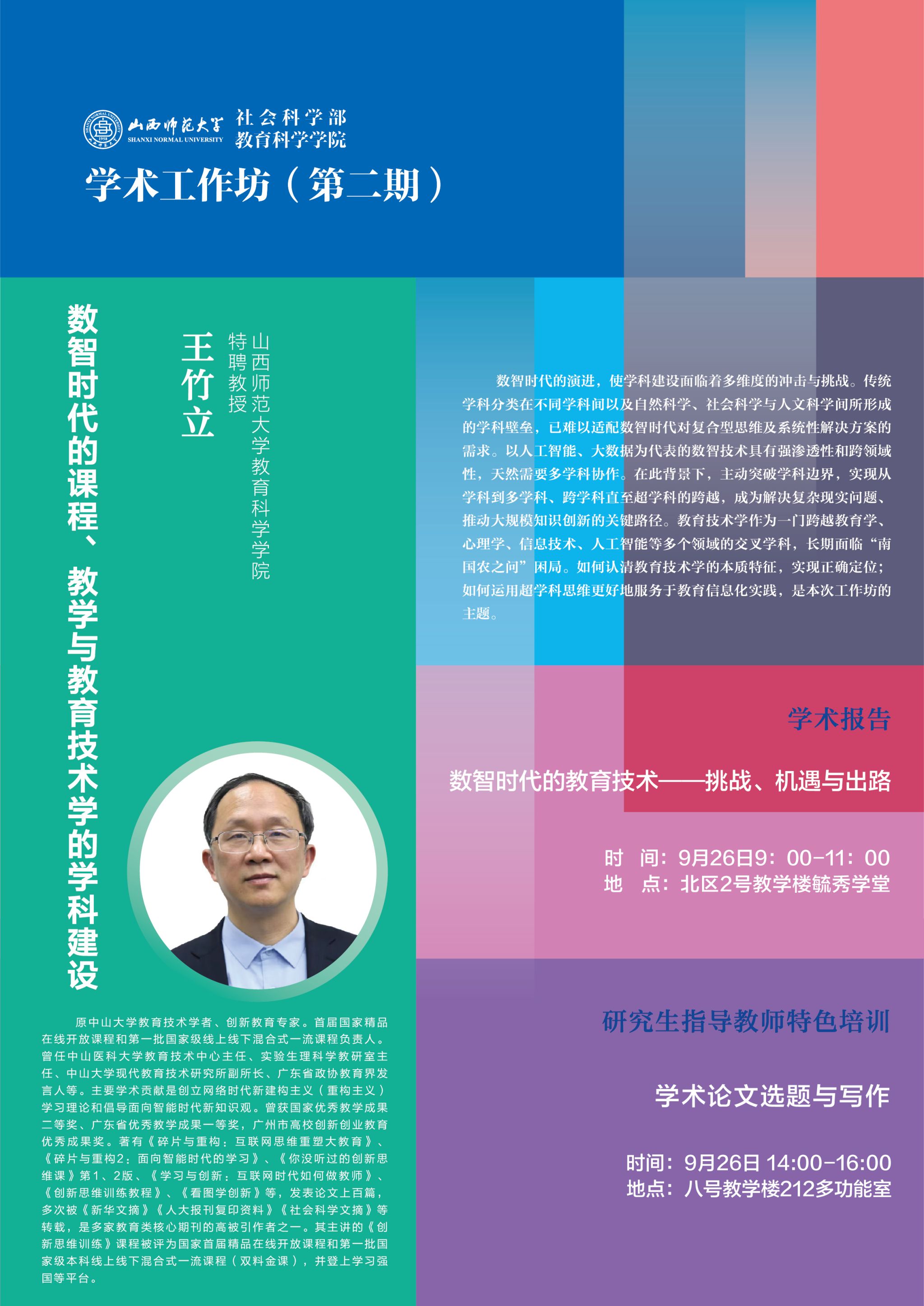 【预告】中山大学教授、山西师范大学特聘教授王竹立应教育科学学院邀请作学术报告