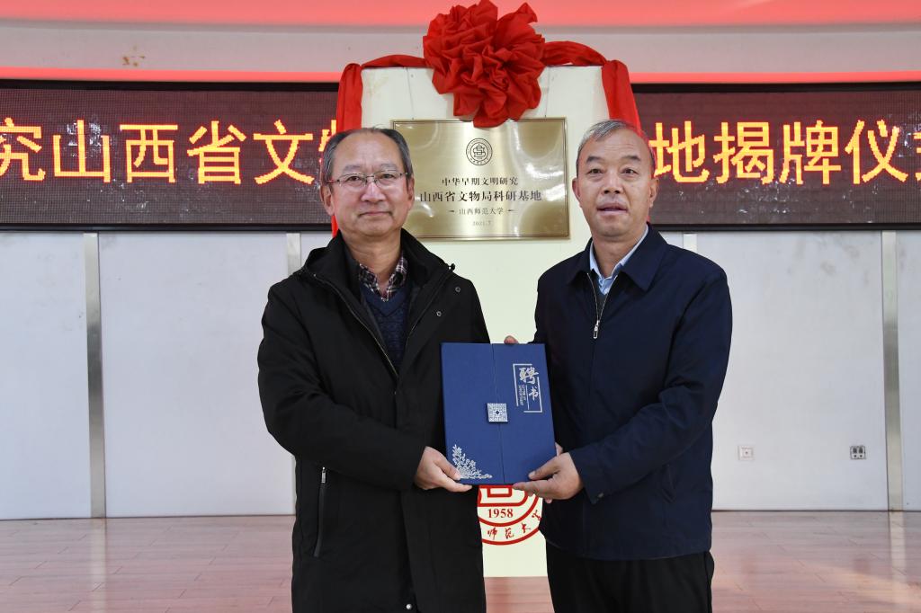 揭牌仪式上,山西省文物局文物科技处处长张晶晶宣读了《山西省文物局关于公布首批科研基地认定名单的通知》,程书林和贾绘泽共同为中华早期文明研究山西省文物局科研基地揭牌,程书林为中华早期文明山西省文物局科研基地主任车文明颁发了聘书。随后,车文明介绍了科研基地建设情况和五年规划。