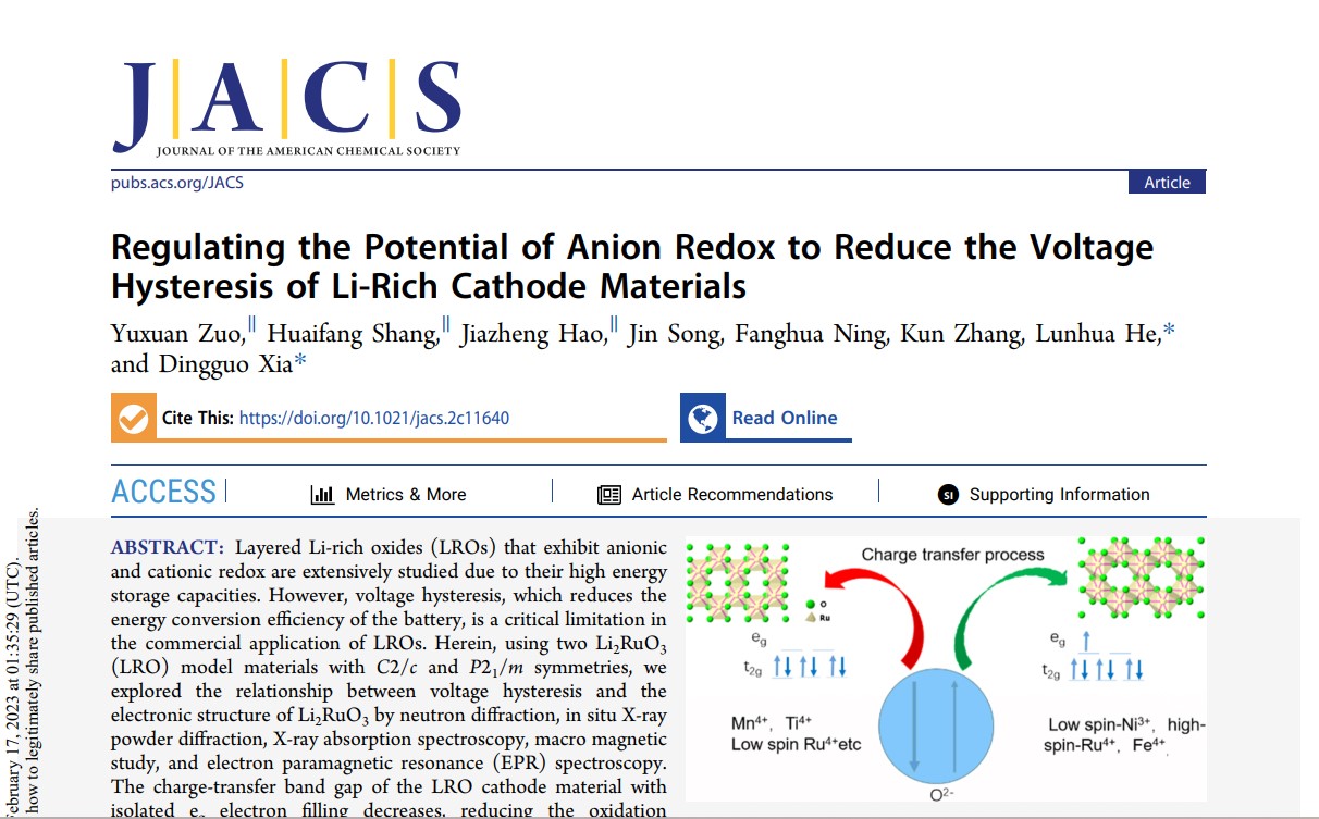 近日,我校化学与材料科学学院尚怀芳老师与北京大学夏定国教授团队合作,在国际上首次提出了通过自旋状态的调制抑制富锂锰基正极材料的电压滞后问题。研究成果以题为“Regulating the Potential of Anion Redox to Reduce the Voltage Hysteresis of Li-Rich Cathode Materials”发表在《美国化学会志》(J. Am. Chem. Soc.)上(SCI一区,影响因子:16.383)。尚怀芳老师在这一发现的实验合成和数据分析方面作了重要贡献,为该论文的共同第一作者。该研究成果得到了国家自然科学基金项目和中科院国际教育合作项目的资助。